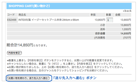 全ての商品が揃ったら、お買い物かご画面の下にある[お買い物を終わり、送り先入力へ進む]をクリックします。